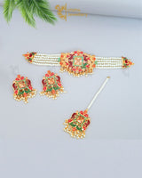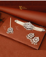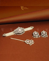 Elevate your style with this soha necklace set, featuring bold square motifs adorned and crystal-clear stones. Accented with dangling embellishments, it exudes royal charm, perfect for weddings or festive events. Complete with matching earrings and a hand accessory for a cohesive, elegant look.